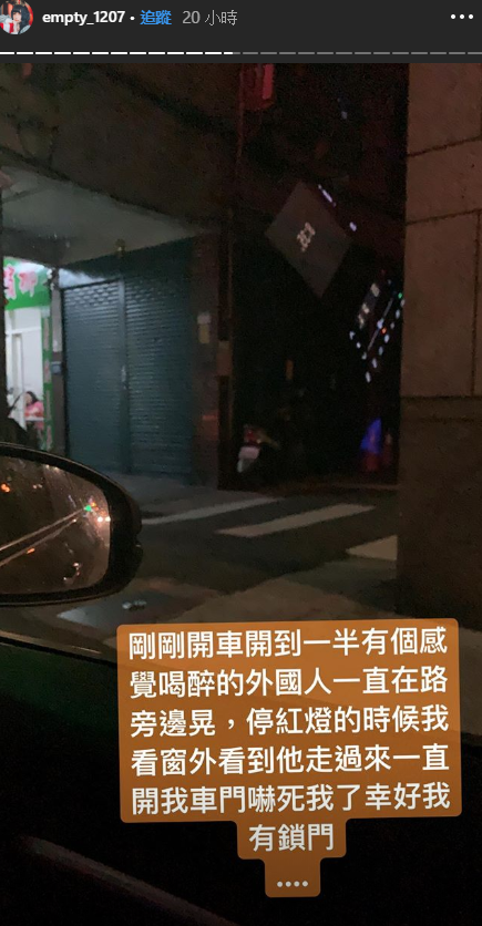 本本昨(20)日在IG限時動態中表示自己開車時,便看到一個感覺喝醉酒的外國人在附近遊蕩,怎料停紅燈時本本望向窗外,竟然驚見對方朝她的車走來,之後更是大力地企圖打開她的車門,讓她受到不少驚嚇,直呼:「嚇死我了,幸好我有鎖門」。