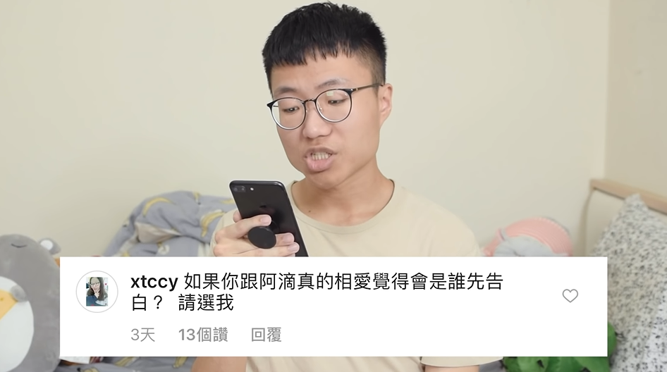 而對於重點問題「跟阿滴是不是在交往?」,大謙也放上了兩人的親密合照,並說,「我很想跟你們公開這件事,但是阿滴跟我說我們要低調,所以我只能跟你們說就是,沒有」,後來又有粉絲提問:「如果你跟阿滴真的相愛覺得會是誰先告白」,他則表示:「就像我剛剛講的,我們要低調好不好」,不過後來他停頓一下,還是搞笑回答:「不過我覺得是他啦」!