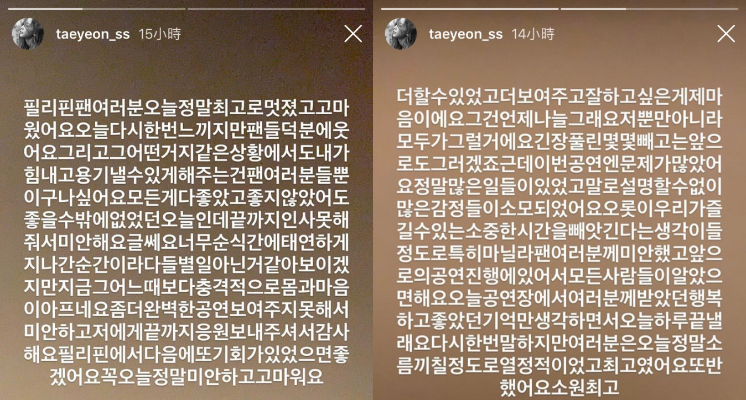 去年12月,太妍的個人第三次巡演抵達菲律賓,不過當天卻不慎發舞台意外,太妍的頭部意外被升降麥克風砸到,雖然一時之間受到驚嚇,不過卻仍秉持專業完成演出,甚至在個人IG表示「所有的一切都很好」。事實上,太姸也在IG中透露事發當時的恐懼,並表示回憶起當時狀況「身體和心靈很疼痛」,不過隨即卻鼓起勇氣說到「我會因為粉絲們而擁有笑容,還有不管在怎樣糟糕的處境中,能讓我鼓起勇氣獲得力量的也只有粉絲們」,文末甚至對舞台意外向菲律賓粉絲道歉。
