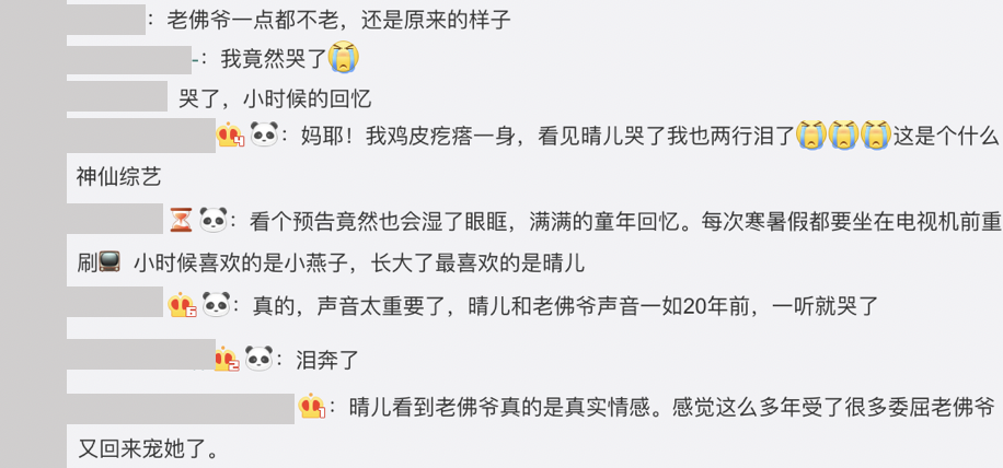 雖然節目尚未播出,但節目釋出預告後,許多網友也紛紛留言表示:「晴兒和老佛爺聲音一如20年前,一聽就哭了」、「晴兒看到老佛爺真的是真實情感。感覺這麼多年受了很多委屈老佛爺又回來寵她了」、「老佛爺一點都不老,還是原來的樣子」、「哭了,小時候的回憶」、「媽耶!我雞皮疙瘩一身,看見晴兒哭了我也兩行淚了,這是個什麼神仙綜藝」,許多網友也都紛紛流下感動的淚水。