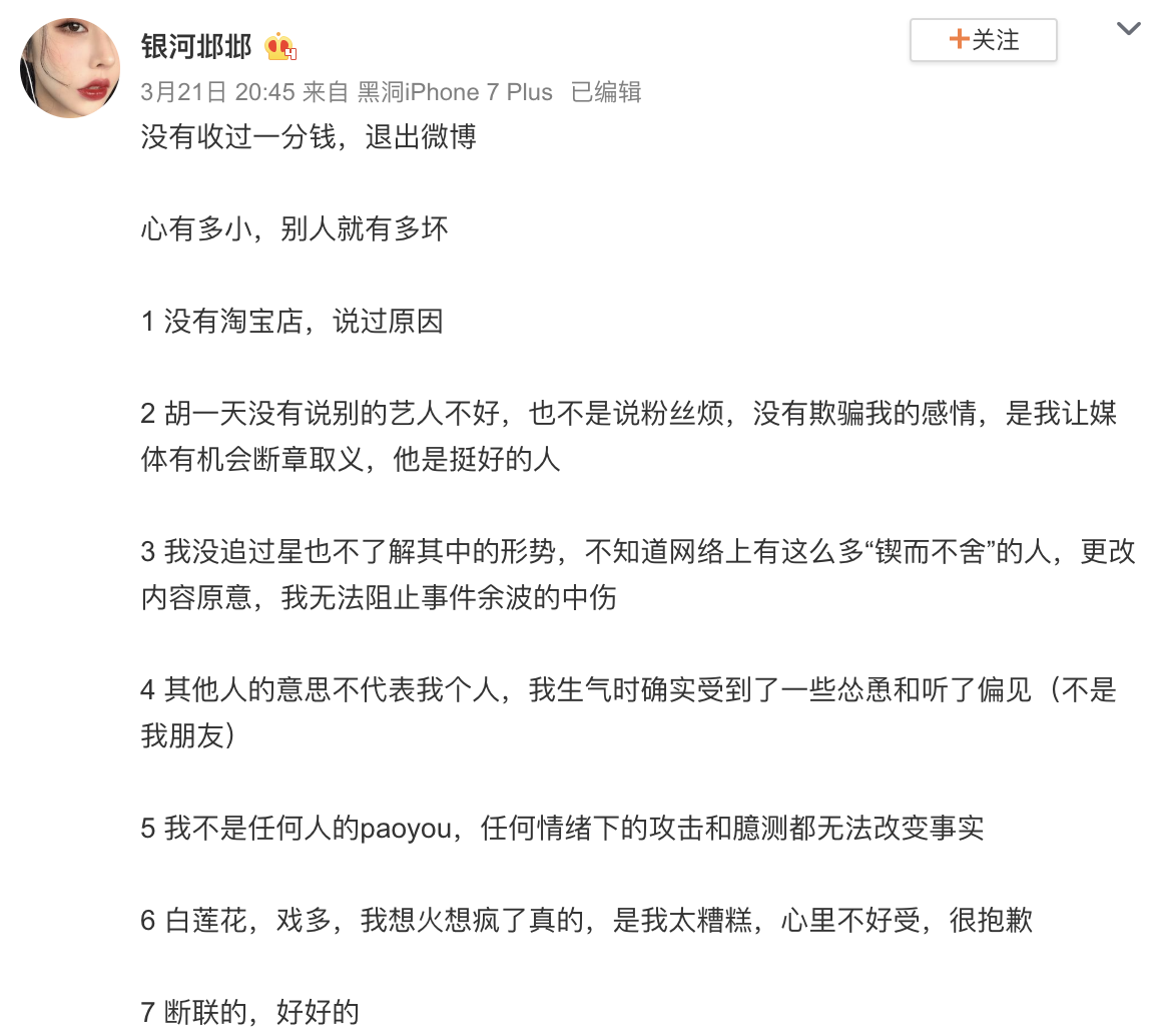 21日晚間,事件女主角「邶也邶」在微博上發出7點聲明,其中在第2點寫下:「胡一天沒有說別的藝人不好,也不是說粉絲煩,沒有欺騙我的感情,是我讓媒體有機會斷章取義,他是挺好的人」,也在第4點時提到:「其他人的意思不代表我個人,我生氣時確實受到了一些慫恿和聽了偏見」,並稱自己「想火想瘋了,是我太糟糕,很抱歉」。