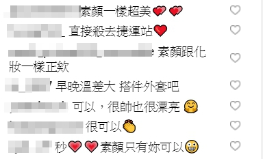 儘管簡廷芮俏皮表示照片有套過濾競,但還是引起許多網友們的關注與稱讚,例如:「素顏一樣超美」、「直接殺去捷運站」、「素顏跟化妝一樣正」、「可以、很可以;素顏只有妳可以」、也有網友暖心提醒:「早晚溫差大 搭件外套吧」。