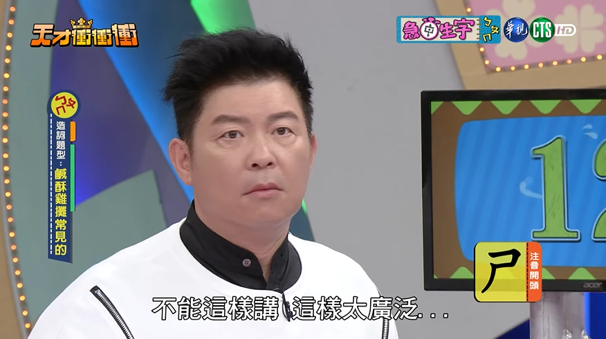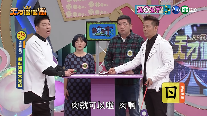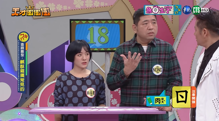 16日播出的《天才衝衝衝》進行「急中生字」單元,看到注音符號就要聯想「在鹹酥雞攤常見的食物」,首先由乃乃隊的NONO對上城城隊的林彥君,NONO一看到「ㄖ」立刻就講了「肉!」這麼廣泛的講法讓曾國城疑惑說:「就講肉就可以啦?!」而徐乃麟也給了肯定的答案。
