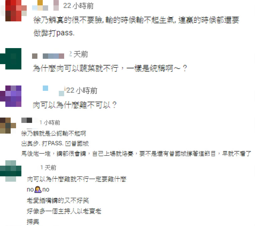 只是網友們看不下去,氣得直批:「肉可以為什麼雞就不行,一定要雞什麼?」、「肉可以為什麼雞不可以?」、「肉可以蔬菜不行,好怪的邏輯」、「為什麼肉可以蔬菜就不行,一樣是統稱啊~?」、「寬以律己,嚴以待人」、「老徐安內母湯喔」、「徐乃鱗真的很不要臉,輸的時候輸不起生氣,連贏的時候都還要作弊打pass」、「徐乃麟就是公認輸不起啊!出奧步、打PASS、凹曾國城」、「換掉徐乃麟啦!」
