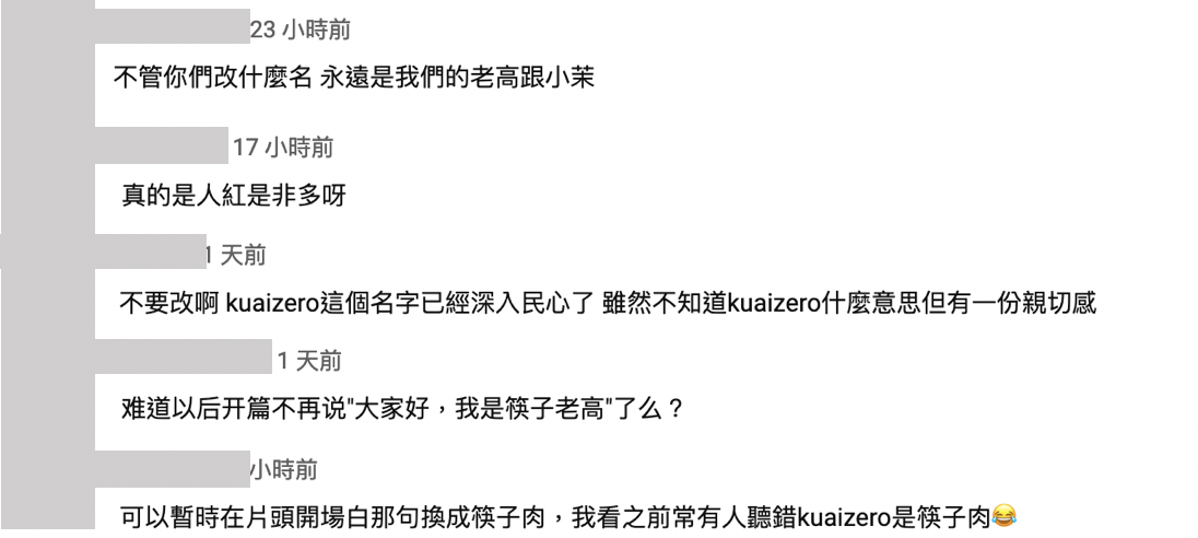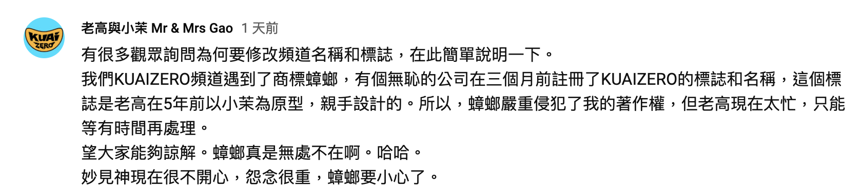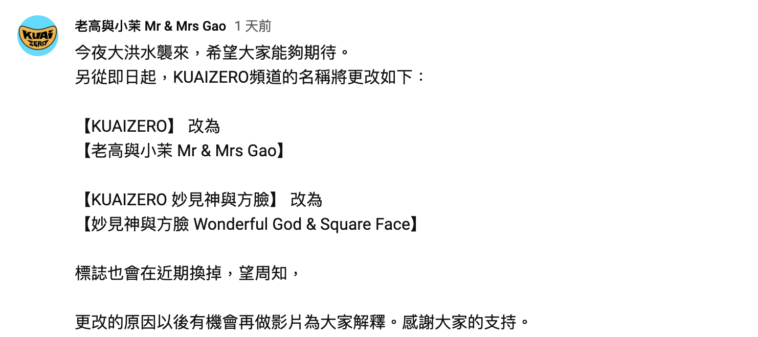 然而老高接著再度發文,並簡單解釋為何頻道會突然改名,寫下:「我們KUAIZERO頻道遇到了商標蟑螂,有個無恥的公司在三個月前註冊了KUAIZERO的標誌和名稱」,但他也提到自己目前太過忙碌,只能等到有時間的時候再處理,也傳遞出小茉對此相當不開心。而網友見狀後也紛紛留言表示:「不管你們改什麼名 永遠是我們的老高跟小茉」、「kuaizero這個名字已經深入民心了」、「難道以後開篇不再說『大家好,我是筷子老高』了嗎?」,網友都感到相當不捨。
