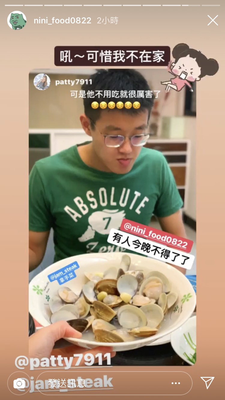 近日牛排的姐姐在IG中上傳一張牛排的照片,只見照片中牛排坐在餐桌前,面前則是滿滿的一盤蛤蜊,而姐姐也搞笑標記妮妮「有人今晚不得了了」,還搞笑爆料,「可是他不用吃就很厲害了」,而妮妮也大方轉發限時動態表示:「吼~可惜我不在家」。