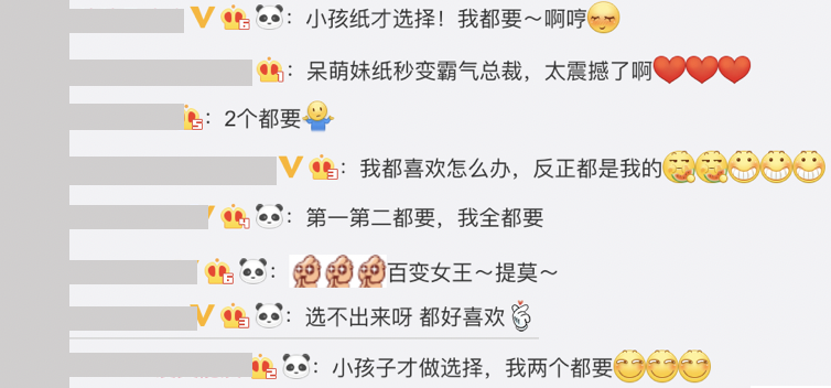 粉絲們看見這部影片後,紛紛留言表示:「小孩子才選擇!我都要~」、「我都喜歡怎麼辦,反正都是我的」、「第一第二都要,我全都要」、「百變女王~提莫~」、「選不出來呀 都好喜歡」、「我想全都要怎麼辦?」、「呆萌妹紙秒變霸氣總裁,太震撼了啊」,引起粉絲們熱烈的迴響。