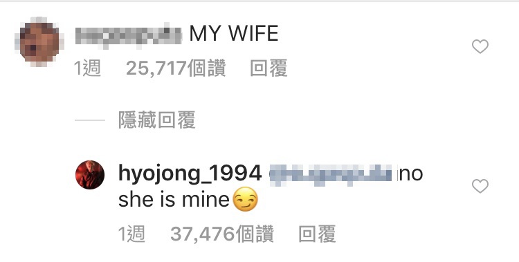 前Pentagon及Triple H成員E'Dawn(金曉鐘)與南韓性感女神泫雅自去年自行承認兩人屬於戀人關係後,就拋開一切包袱的大肆放閃。18日,E'Dawn在自己的IG上傳了一張只有泫雅的照片,就有網友在貼文下面留言「我的老婆(MY WIFE)」,E'Dawn馬上回應「不,她是我的(no she is mine)」,讓底下許多網友羨慕又嫉妒她們兩人的好感情。