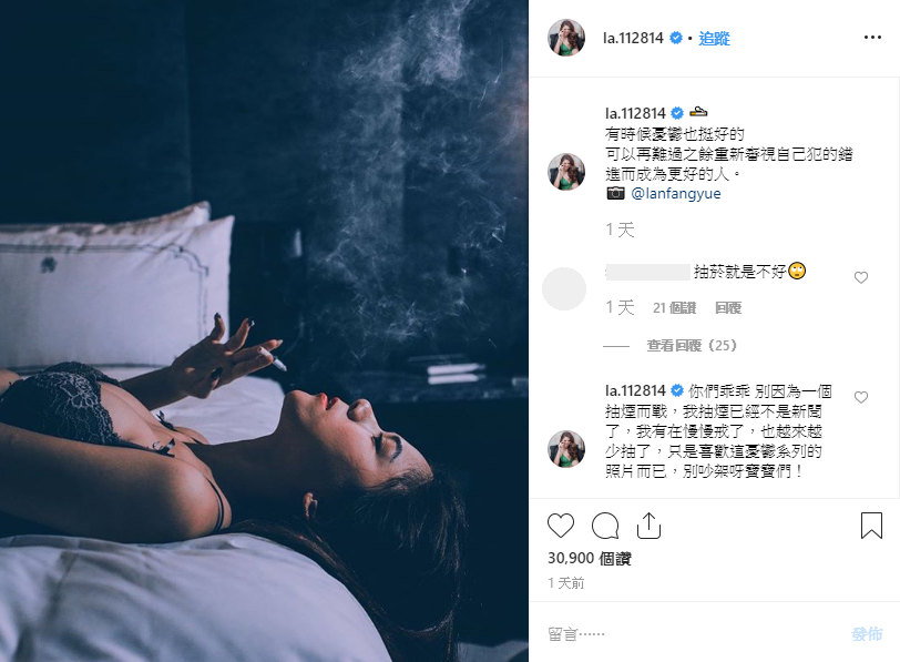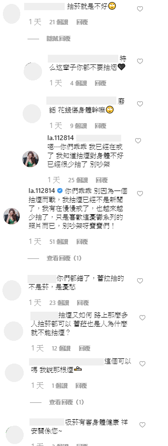 不過另一方面,也有網友持相反觀點,「抽煙又如何 路上那麼多人抽菸都可以 蕾菈也是人為什麼就不能抽煙?」、「你們都錯了,蕾拉抽的不是菸,是憂愁」,更有網友因此吵起來,你一言我一語相當火爆,最後蕾菈也留言緩頰:「嗯⋯你們乖乖 我已經在戒了 我知道抽煙對身體不好已經很少抽了 別吵架」,她也再度解釋自己只是很喜歡這系列的照片,現在已經慢慢戒菸,很少抽了 !
