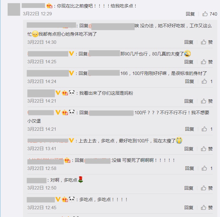 不少網友紛紛留言表示:「你現在比之前瘦吧!!!!給我吃多點!」、「上去上去,多吃點,最好吃到100斤(50公斤),現在太瘦了」、「多吃點,多吃點!!!!」、「小朋友該吃飯就吃飯 多吃別太累了」、「咱們能不能長點肉呀!你這個太瘦了,多吃點胡蘿蔔」希望她多吃一點,並好好照顧好自己的身體。