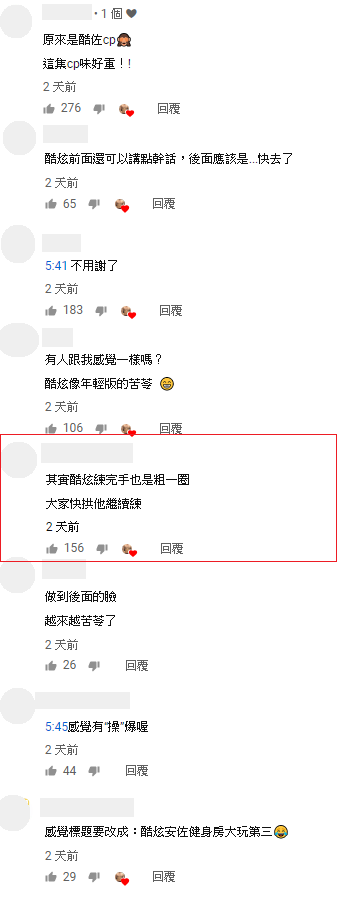 訓練完手臂之後,兩人也一起秀出手臂,因為剛剛訓練完充血的緣故,酷炫的手也比剛開始時粗了一圈,酷炫還笑稱:「看一下我被羞辱的樣子」!影片上傳之後,則有許多網友留言:「原來是酷佐cp 這集cp味好重!!」、「酷炫前面還可以講點幹話,後面應該是...快去了」、「做到後面的臉 越來越苦苓了」、也有網友看見酷炫的改變,力拱他繼續健身:「其實酷炫練完手也是粗一圈 大家快拱他繼續練」。