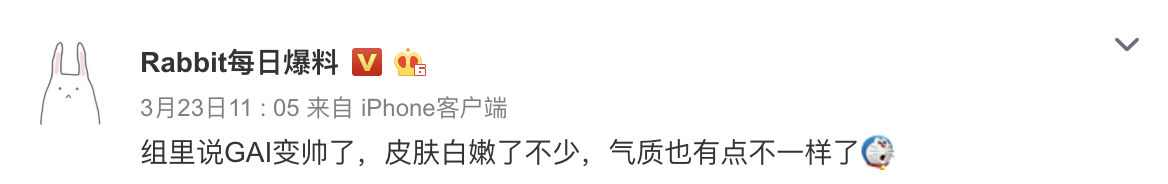 在微博上有位知名博主發出一組GAI參加生日派對時的照片,並寫下:「組里說GAI變帥了,皮膚白嫩了不少,氣質也有點不一樣了」,照片中GAI將頭髮稍微留長了一些,皮膚和過去相比也較為白皙,畫面中他也一直都面帶著笑容,看起來相當和藹親切。網友見狀後也紛紛表示:「一白遮三醜,看著人也溫和不少,確實比以前順眼多了」、「這是走偶像派了」、「長頭髮了」、「感覺變乖了」、「怎麼感覺換了個人呢」