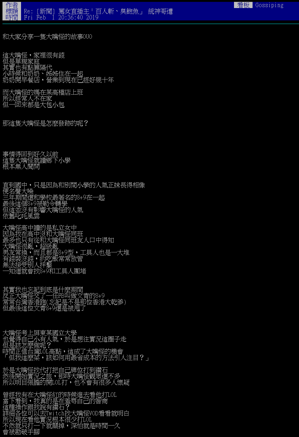 原PO表示大嘴怪是單親家庭,奶奶開早餐店,媽媽則在某高檔店上班,不過她卻「有錢裝沒錢」。上了大學之後,她找代打把遊戲LOL打到鑽石牌位,接著利用自己的名氣和牌位,開始蹭上許多知名選手,因為害怕露出破綻,之後也鮮少再打LOL。