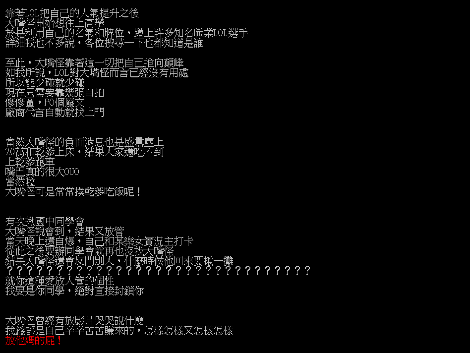 原PO還表示大嘴怪已經接受過訪問,不過訪問內容顛三倒四,「自己私德如何,還真以為紅了就沒人知道」,他也說大嘴怪現在常常跟酷炫合作,暗指她利用對方,「反正等到一個時間點後,酷炫絕對會被拋棄,就像從前被大嘴怪甩開的那些職業選手一樣」。