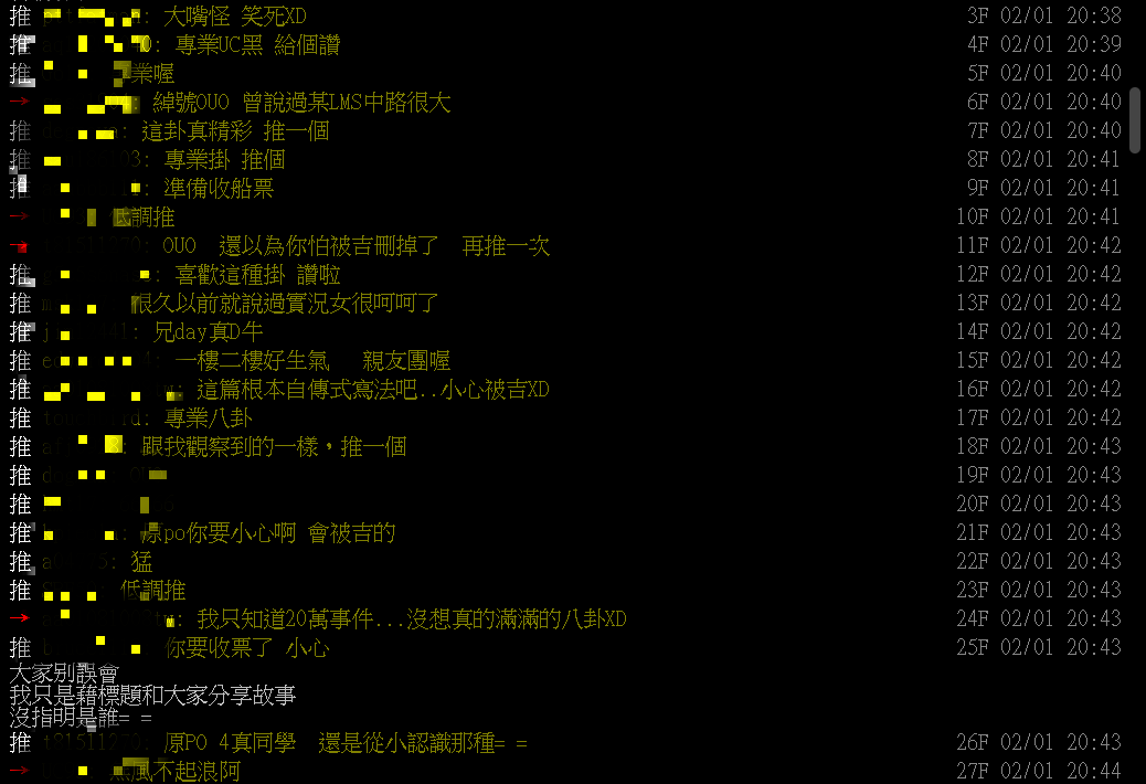 而原PO則強調自己「藉標題和大家分享故事,沒指名是誰」,不過其他鄉民仍提醒,「大家都知道你指的是誰還是能收票 除非你明確說不是他」,而這次的精采爆掛,仍引起高度討論,直到現在都成為網民茶餘飯後的話題。