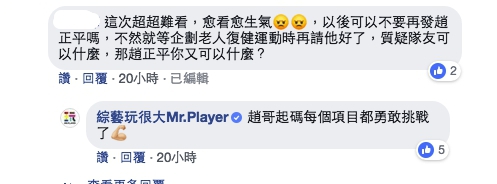 但節目片段一出,不少網友看了十分生氣,直接到《綜藝玩很大》粉絲頁狂罵:「以後可以不要再發趙正平嗎,不然就等企劃老人復健運動時再請他好了,質疑隊友可以什麼,那趙正平你又可以什麼?」對此,節目組也替他說話:「趙哥起碼每個項目都勇敢挑戰了。」節目方也出面回覆,就算是廢,至少都有踏出第一步挑戰了,強調每個人都各有弱項,「怎麼可能人人都是遊戲王?」不過也有網友覺得趙哥的「廢」表現反而「笑」果十足「奇怪,我覺得這集超棒,怎麼大家都在罵,從頭到尾,各種型態的綜藝效果都有出來,看完心情超好的」、「這集好好看!我喜歡」。