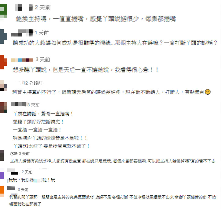 不少網友看了這段相當氣憤,認為主持人不僅頻頻打斷丫頭講話,甚至把別人認真付出當作玩玩,紛紛直說:「利菁訪問丫頭那一段簡直是主持的完美反面教材,功課不足、各種打斷,不但冷場效果還做不出來,幸虧丫頭準備的多,不然場面就乾在那裡了」、「想聽丫頭好好把話講完!」、「想多聽丫頭說,但是天后一直不讓她說,我看得很心急!」、「為何丫頭講到重點,你都插話」、「主持人講話有夠沒水準,人家認真做生意卻被說只是玩玩」。