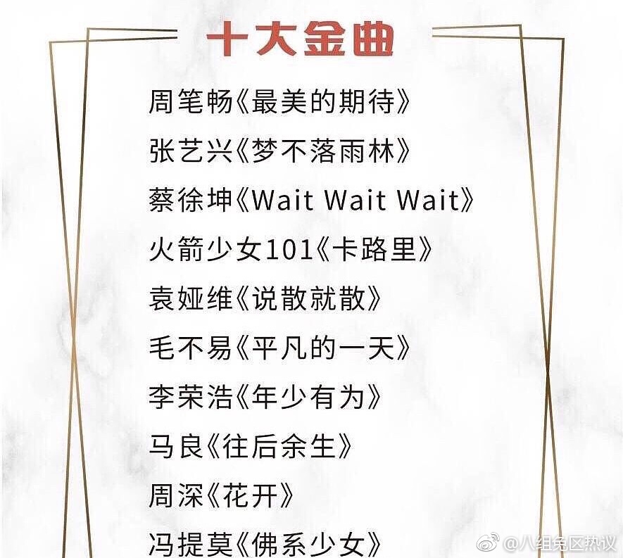 十大金曲榜從第一名到第十名分別是:周筆暢《最美的期待》、張藝興《夢不落雨林》、蔡徐坤《Wait Wait Wait》、火箭少女101《卡路里》、袁婭維《說散就散》、毛不易《平凡的一天》、李榮浩《年少有為》、馬良《往後餘生》、周深《花開》、馮提莫《佛系少女》。
