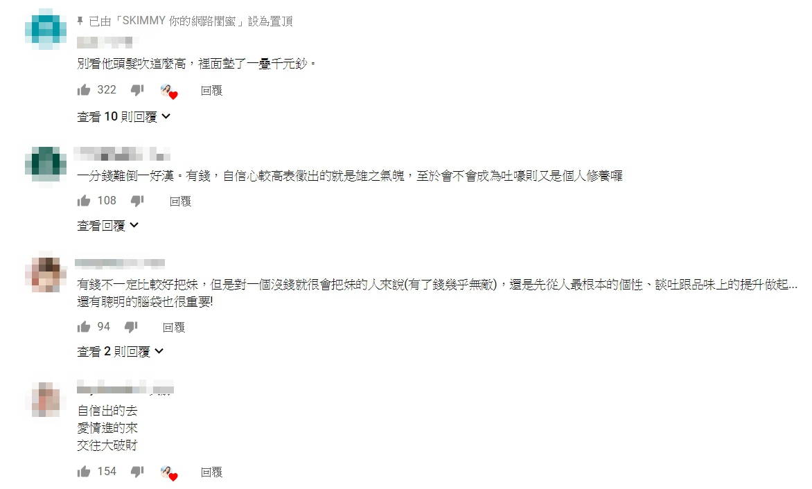 對於Joeman的言論,網友們也都逗趣地表達:「別看他頭髮吹這麼高,裡面墊了一疊千元鈔」、「一分錢難倒一好漢。有錢、自信心較高表徵出的就是雄之氣魄,至於會不會成為土豪則又是個人修養囉」、「有錢不一定比較好把妹,但是對一個沒錢就很會把妹的人來說(有了錢幾乎無敵),還是先從人最根本的個性、談吐跟品味上的提升做起...還有聰明的腦袋也很重要!」、「自信出的去 愛情進的來 交往大破財」。
