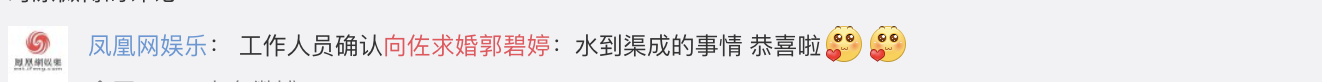 根據陸媒報導指出,3月17日晚間,向佐和郭碧婷出現在台北信義區的寒舍艾麗宴會廳,晚間9點多時,穿著大紅上衣配上黑色長褲的郭碧婷,與一身帥氣西裝的向佐才現身,而媒體也捕捉到郭碧婷的手上出現了一顆之前從未見過的超大鑽戒,傳出當晚向佐策劃了一場「求婚趴」,雖然兩人僅短短在一起三個多月,但向佐父母對於郭碧婷相當讚不絕口。然而陸媒也向郭碧婷方求證,得到鄭時候,網友們也紛紛獻上祝福。