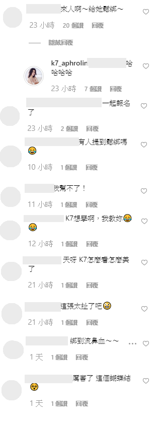 照片上傳之後,則有許多網友留言:「來人啊~給她鬆綁~」、「五花大綁」、「一起報名了」、「有人提到鬆綁嗎」、「K7想學啊,我教妳」、「凱琪好正+好辣」、「來凱琪幫妳綁 love凱琪」、「這張太扯了吧」、「天呀 K7怎麼看怎麼美了」、「厲害了 這個蝴蝶結」。