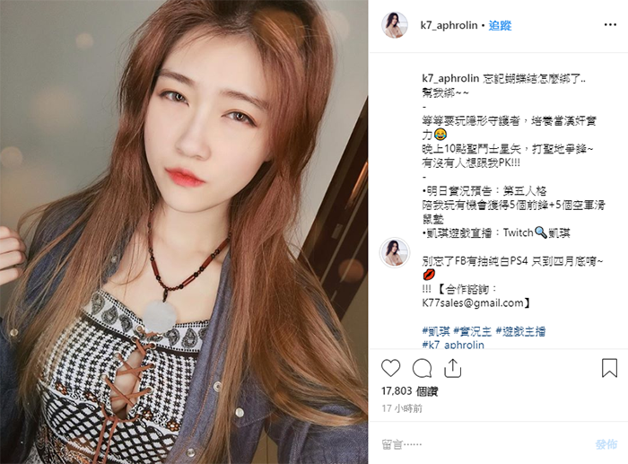 凱琪外型甜美,更有E罩杯的傲人雙峰,她平時除了在頻道「K7凱琪」中開遊戲實況之外,也會上傳自己的歌曲cover影片,好歌喉深受粉絲喜愛。而身為瑀熙好友的她,過去便常常出現在瑀熙的影片中,和瑀熙同為人氣實況主。而近日凱琪在自己的IG中發布近照,讓網友鼻血直流!
