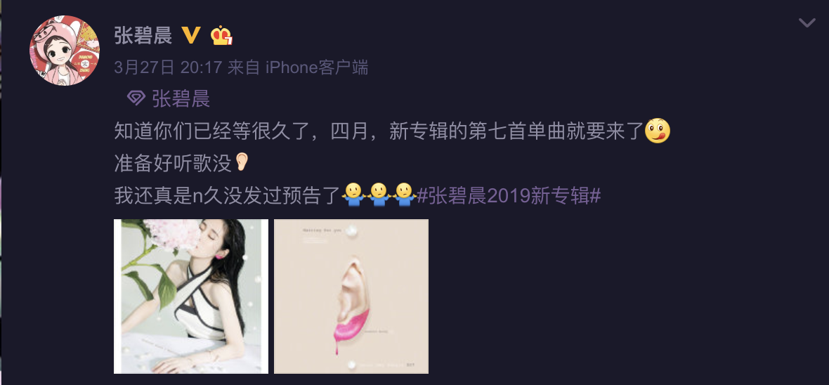 張碧晨的聲音蘊藏著滄桑感,流暢的真假音轉換,讓人留下深刻的印象。粉絲盼了又盼,偶像終於在微博發佈今年2019年4月要發最新單曲,讓大家準備好新專輯的道來!