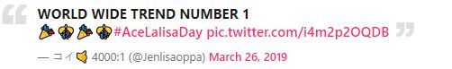 這個月3日,女團BLACKPINK的世界巡演來到台灣的林口體育場舉行,吸引大批粉絲到場支持,27日,成員Lisa迎接他的22歲生日,包括網友和身邊好友都用各自的方式為他慶生,甚至一度成為推特上擁有最多生日祝福的藝人,大批粉絲在推特上以標記「#AceLalisaDay 」慶祝Lisa生日,一時之間成為全球熱搜第一,也以一百萬則貼文祝福打破全世界的女藝人紀錄。