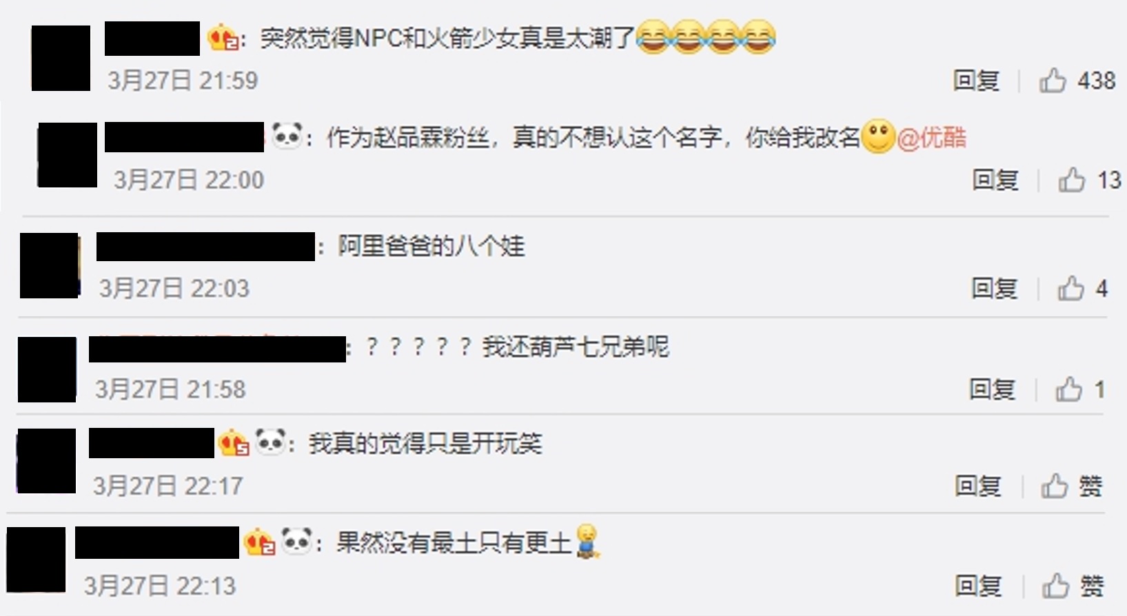 此消息一出隨即引起熱烈討論,許多網友們都覺得這名字太好笑太土了,甚至有網友表示:「突然覺得NPC和火箭少女真是太潮了」、「給我改名」、「我還葫蘆七兄弟呢!」、「我真的覺得只是開玩笑」、「果然沒有最土只有更土」。