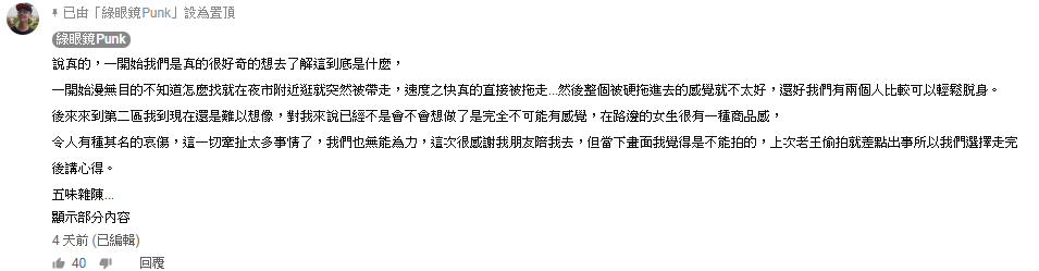 不過綠眼鏡也說明這次的經歷讓他一點感覺都沒有,「對我來說已經不是會不會想做了,是完全不可能有感覺,在路邊的女生很有一種商品感」,五味雜陳。而影片上傳之後,則有粉絲調侃他,「老司機也有怂的一天啊」。