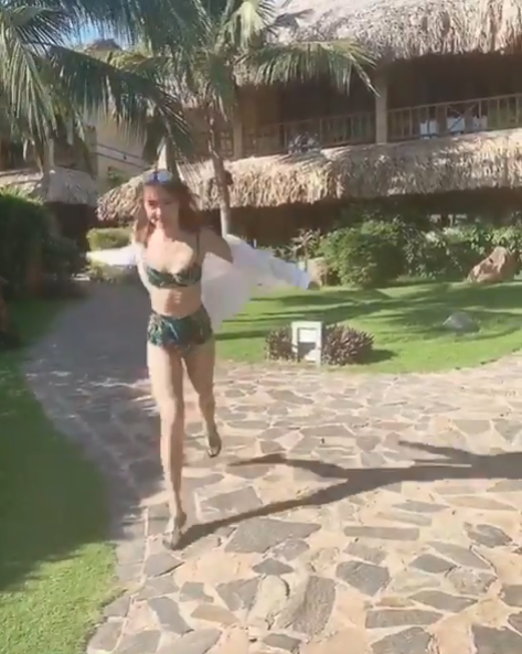 影片中,她穿著稍早曝光的綠色比基尼,從遠處跑向鏡頭,白皙的肌膚在陽光下「美的發光」,平坦的小腹及一雙筆直長腿也讓粉絲看了都快噴鼻血。雖然簡廷芮害羞表示「那個…正面照…先不要吧」,但仍在底下標籤「只能這樣了」,看似正在回應粉絲要求,也算是一種另類的有求必應。