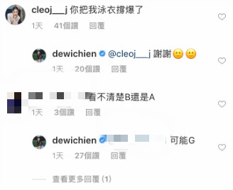 不少網友看了紛紛直呼:「這樣太危險」、「看了100次」、「衣服穿好!」不過,有男網友看到她的好身材,好奇留言:「看不清楚B還是A(罩杯)!」她則逗趣的說:「可能G。」就連她的模特兒姐姐簡婕也在底下留言「妳把我泳衣撐爆了」,對此她則笑回「謝謝」,看得出對自己的健身成效相當滿意。