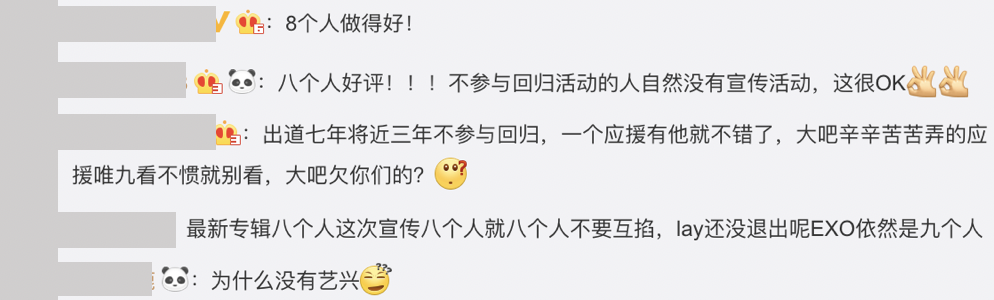 然而有張藝興的粉絲跳出來替他說話,去年EXO分隊進行宣傳時,張藝興曾轉發過邊伯賢在推特上的宣傳貼文,也曾親自飛到韓國錄製現場替成員們應援,該名粉絲發出的照片上敘述著當天的情況與互動,然而底下的網友也紛紛表示張藝興仍然是EXO成員之一,希望不要再分9人或者是8人,粉絲們都能和平的相親相愛。