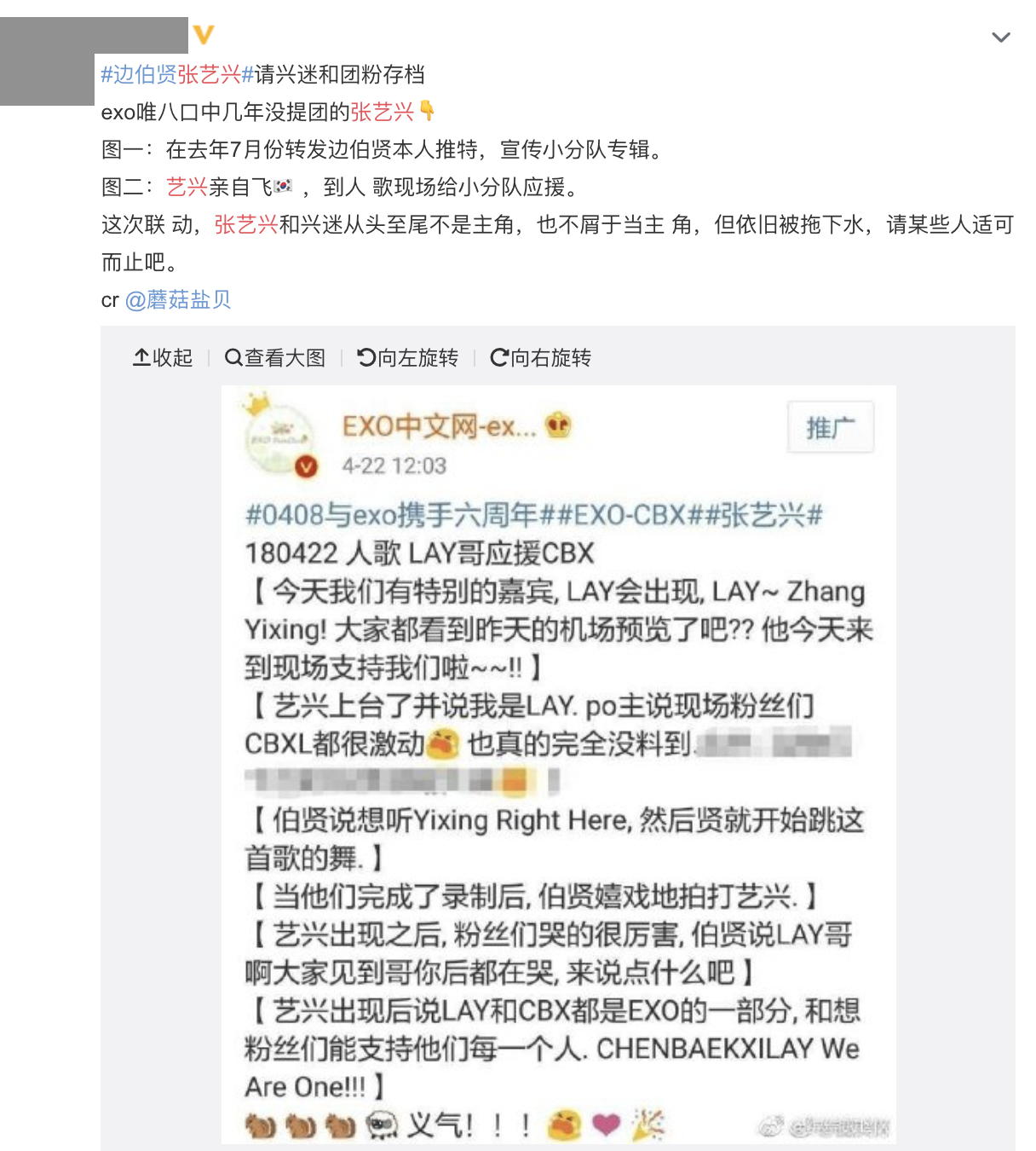 EXO陸籍成員「張藝興」自2015年時開始在大陸演藝圈發展,不僅會唱歌也會演戲,曾出演過多部電視劇以及電影,在大陸發展的相當順利。然而近日卻爆出EXO粉絲們因成員「邊伯賢」的一則貼文而開始互相內鬨,認為他公然排擠張藝興,在微博上引發熱議。