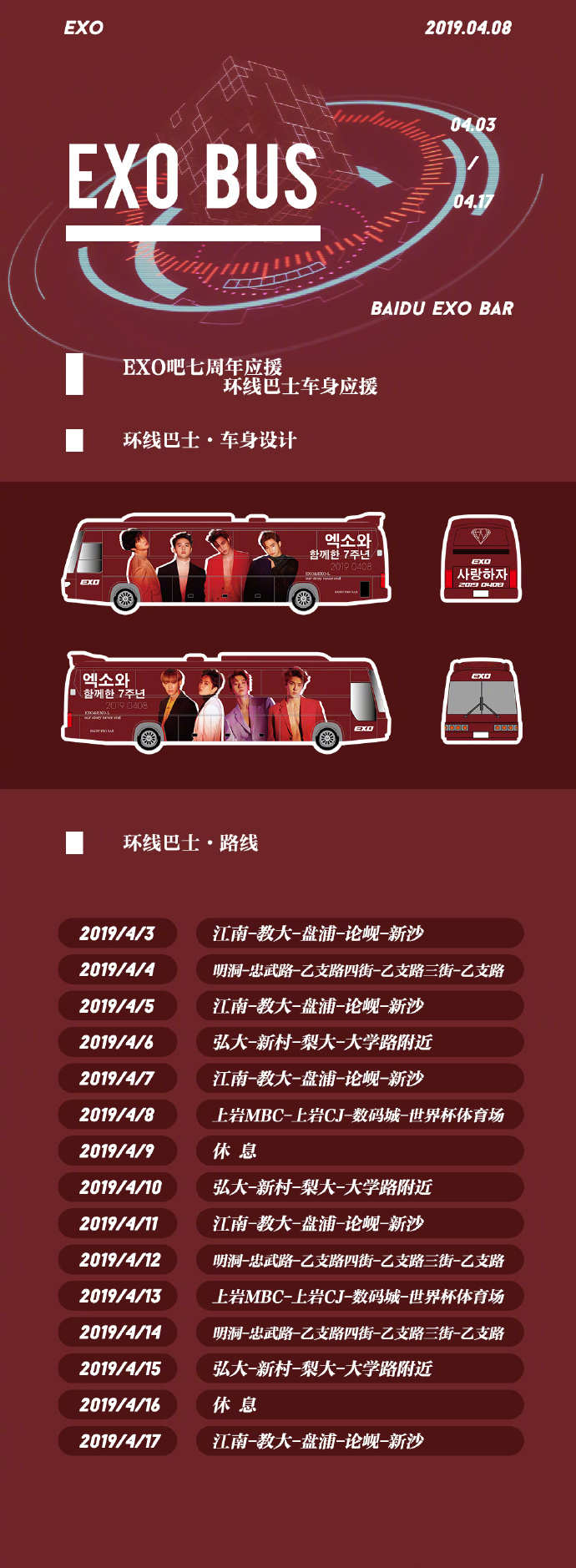 除了邊伯賢的貼文之外,EXO粉絲們為了慶祝偶像出道七週年,在首爾的巴士上進行車體的應援,公車的外觀將會是EXO的車身,並於4月初開始在首爾路上巡迴,然而粉絲團公佈的設計照片中,僅僅只有8個人,唯獨缺少了張藝興。EXO團粉們也紛紛在下方留言:「8個人做得好!」、「八個人好評!!!不參與回歸活動的人自然沒有宣傳活動,這很OK」,但也有部分粉絲在下方留言:「lay還沒退出呢EXO依然是九個人」、「為什麼沒有藝興」,對於沒有出現張藝興感到困惑。