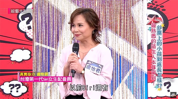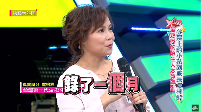 這幾句超經典的語句一出,讓現場來賓驚呼連連,就連主持人吳宗憲都忍不住大喊:「就是你啊!」盧怡君是台灣第一代Siri的女生配音員,2012年開始錄製語句,當時錄製就錄了1個月,一天大概都要錄2~3小時。錄音時,其實是很順暢地把所有的句子一起錄完,手機用戶所聽到的回覆,其實是經過截取的,所以多少還是會有一些機器的聲音。