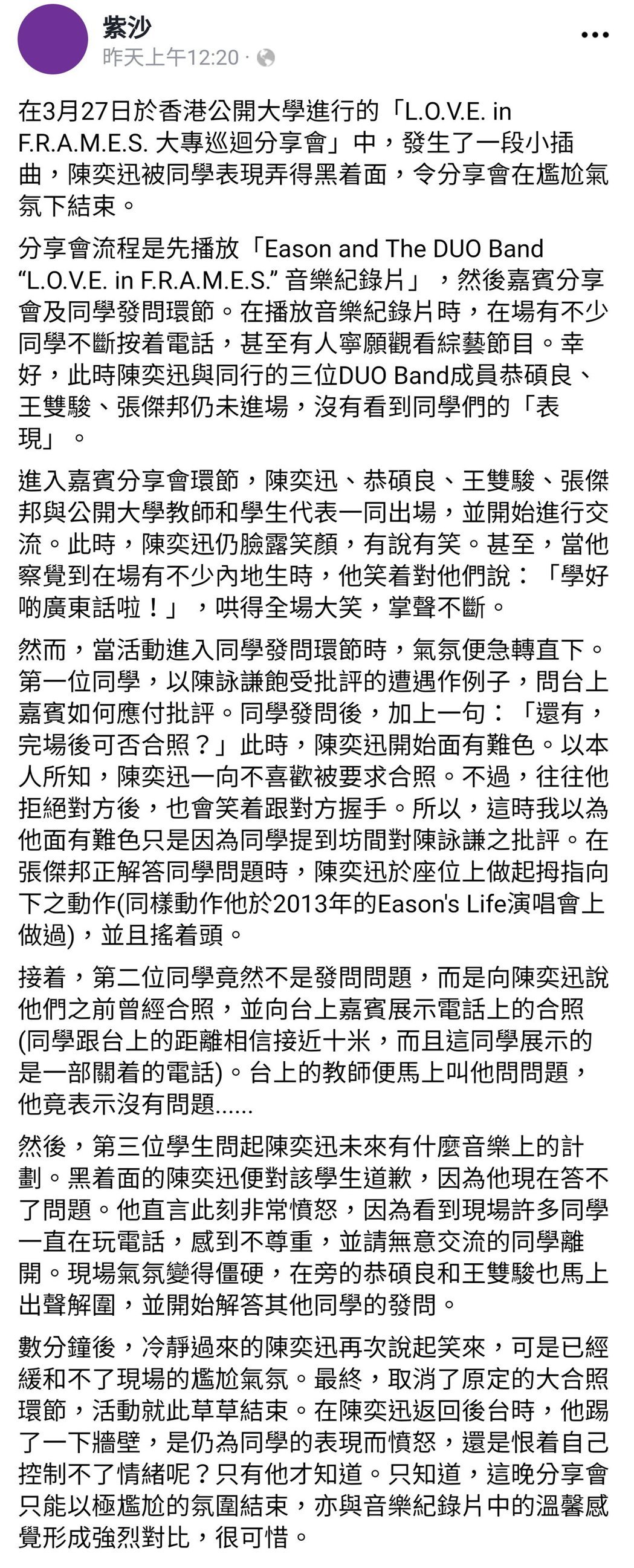 該名學生更寫下:「數分鐘後,冷靜過來的陳奕迅再次說起笑來,可是已經緩和不了現場的尷尬氣氛。」,並提到最後草草結束了活動,也取消了原先大合照的環節,在陳奕迅返回後台時,更踢了一下牆壁,讓該名網友困惑不知道陳奕迅「是仍為同學的表現而憤怒,還是恨着自己控制不了情緒呢?」