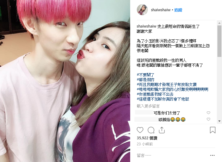 事實上去年12月時,笑笑才在IG中貼上兩人親嘴的照片宣布「交男友了」,不過後來則澄清是為了拍片才惡搞,這次兩人突然認愛,也讓網友半信半疑。