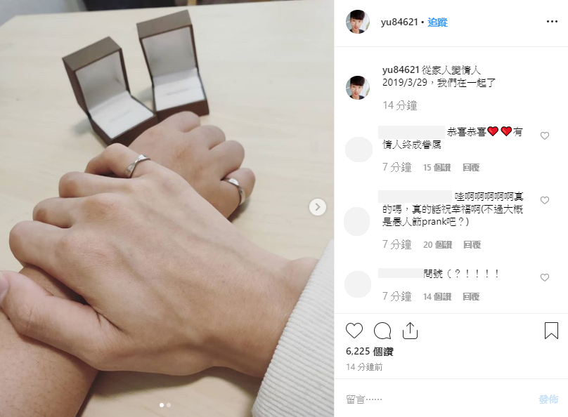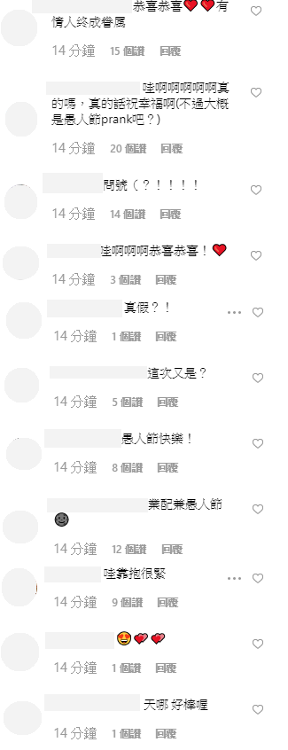 而文章發布之後,則有許多網友紛紛留言:「哇靠抱很緊」、「天哪 好棒喔」、「哇啊啊啊恭喜恭喜!」、「哇啊啊啊啊啊真的嗎,真的話祝幸福啊」、「恭喜恭喜,有情人终成眷属」,不過同時因為日期相當接近4月1日愚人節,也有許多網友猜測可能是為此惡搞!