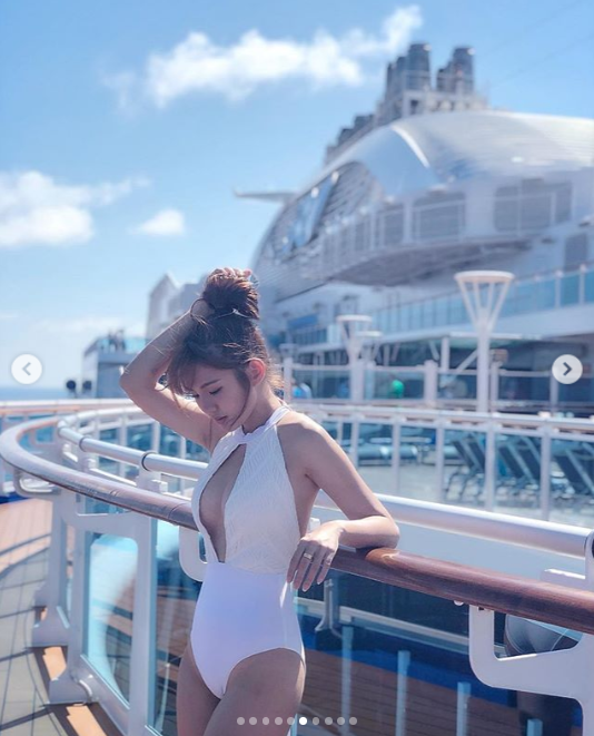 在郵輪上,鮪魚在泳池邊換上純白的性感連身泳裝,正面中間開了超大洞,從脖子下方一路開到肚臍,大方秀出東西半球。從背面看上去,腿部的線條也非常勻稱,連美背也一覽無遺,無論正面反面都能看出鮪魚的好身材。