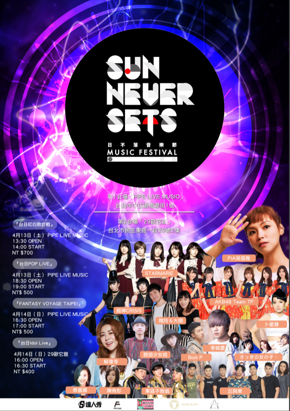 首次舉辦的「日不落音樂節」,將在台北PIPE Live Music舉行,活動4/13~4/14為期2天,串聯台灣與日本的表演者,就像日本知名的「紅白歌合戰」一樣,現場由超過10組的台灣與日本藝人輪流上台表演,表演將透過台灣達人秀以及Line TV進行線上轉播,並且收錄為電台內容在日本放送。除了實力派的解偉苓將大展歌喉,來自日本的「STARMARIE」來台表演超過30次,實力堅強、知名空氣樂團金爆的師妹「姬神CRISIS」,也將以驚艷的舞蹈及唱功完美融合,日本團體「さっきの女の子、」、「Chunk Variety」、「kaska」、「Touma Rose」也勢必將帶來精彩演出。