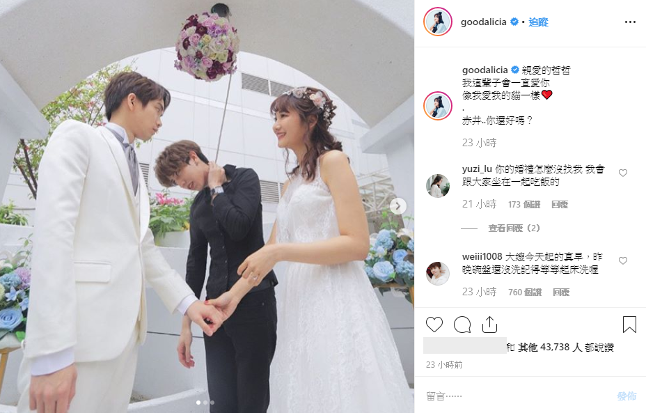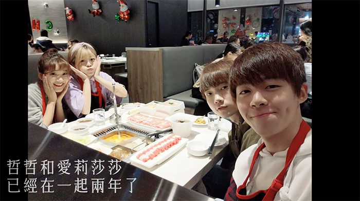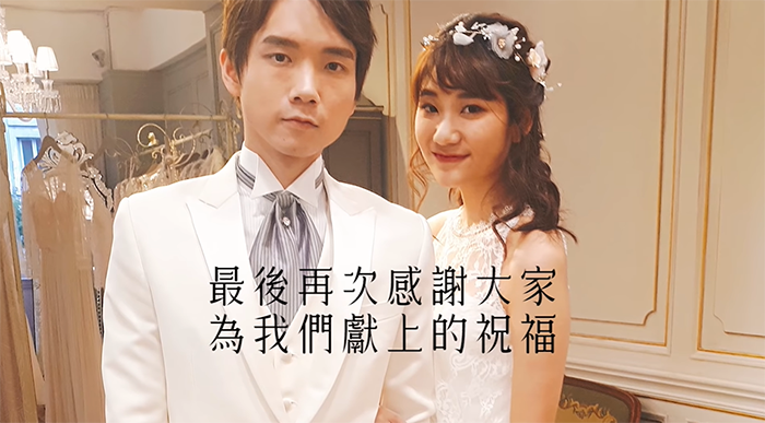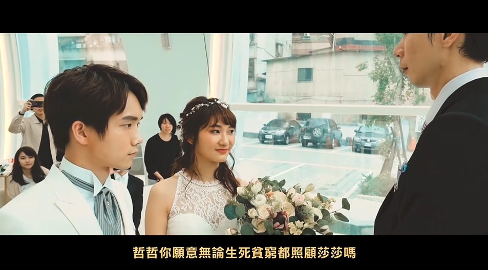 到了婚禮的關鍵環節,兩人都甜蜜說出:「我願意」,哲哲也甜蜜親吻愛莉莎莎!影片最後黃氏兄弟則打上:「哲哲和愛莉莎莎已經在一起兩年了」,表示兩人密戀兩年終於修成正果,也感謝所有親朋好友送上祝福!而隨後愛莉莎莎也PO文˙:「親愛的哲哲,我這輩子會一直愛你,像我愛我的貓一樣」,甜蜜告白。