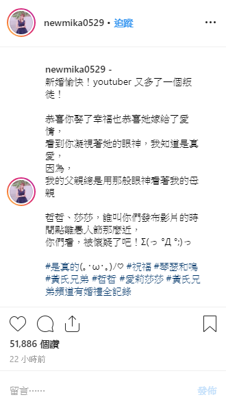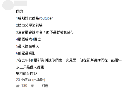 不過其實有網友發現這個婚禮紀錄漏洞百出,「1、親朋好友都是youtuber 2、雙方父母沒到場 3、宣言那會說本名,而不是哲哲和莎莎 4、那個親吻是借位 5、愚人節在明天 6、感覺是業配」,識破這疑似是愚人節企劃,不過哲哲的好友「球球」,則特別發文祝福:「恭喜你娶了幸福也恭喜她嫁給了愛情,看到你凝視著她的眼神,我知道是真愛,因為,我的父親總是用那般眼神看著我的母親」,還表示兩人的好日子接近愚人節,才會被懷疑,一番話又讓許多網友半信半疑。