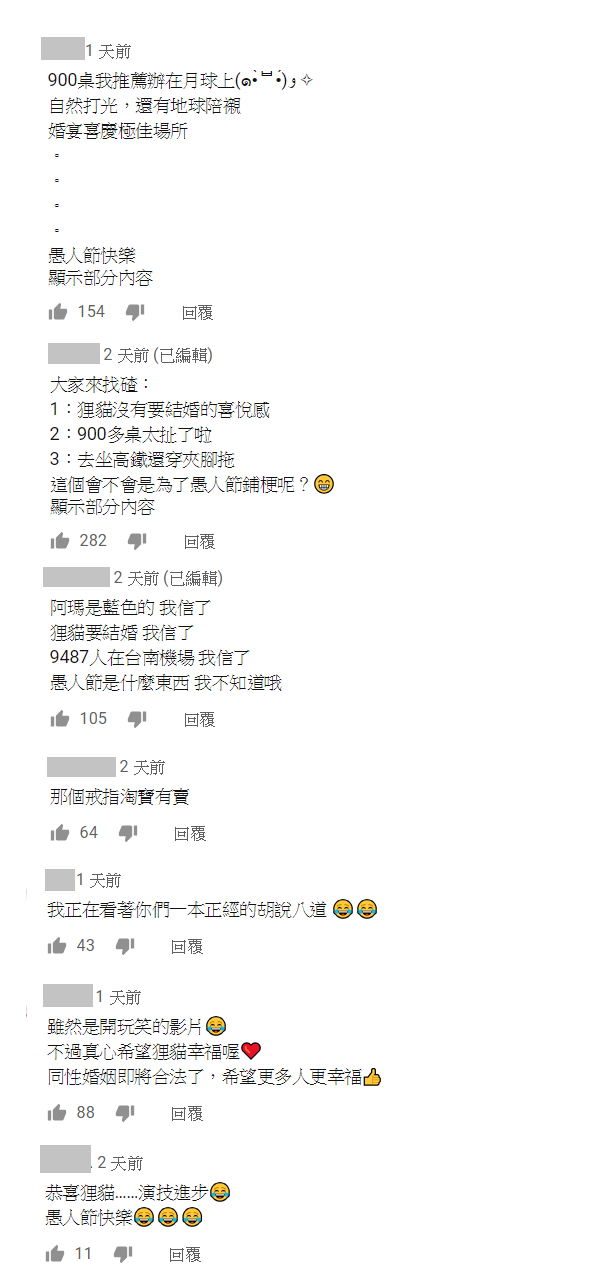 然而,身為「志銘」與「狸貓」的資深粉絲,網友們對於這支影片的真實性相當懷疑,甚至認為這是「愚人節的騙局」,紛紛表示「愚人節快樂」「這個會不會是為了愚人節鋪梗呢?」「狸貓要結婚 我信了9487人在台南機場 我信了 愚人節是什麼東西 我不知道哦」「那個戒指淘寶有賣」,十分逗趣。