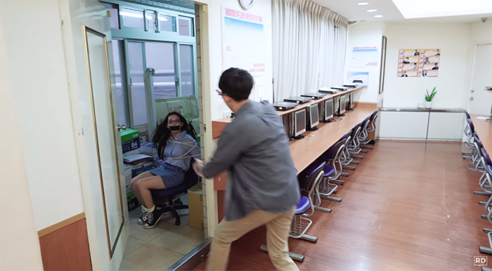 而在影片最後,阿滴在補習班走廊喊話大家趕快報名,鏡頭帶到了一旁辦公室中被綁住的滴妹,阿滴則慌亂關門,畫面十分逗趣。而影片播出後,呱吉則在下方留言:「滴妹的綁法跟去年一樣專業」,另外也有網友發現滴妹的襯衫因為被繩子綁住的關係相當緊繃,「滴妹的胸罩是不是要爆開了XD??」,
