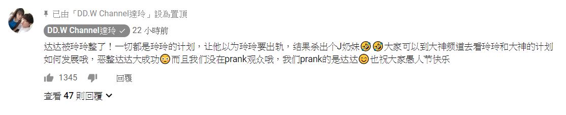 影片上傳後,一切的幕後主使者「玲玲」則開心的表示「惡整達達大成功」,更開心的祝福觀眾們「愚人節快樂」。