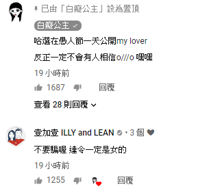 痴痴接著表示兩人已起在一起相當長的時間,相處模式就是影片上呈現的樣子。影片播出之後,她也在留言處表示:「哈選在愚人節一天公開my lover 反正一定不會有人相信o///o 嘿嘿」,不過YouTuber壹加壹則搞笑懟她:「不要騙喔 達令一定是女的」,也因為痴痴對男友的廬山真面目仍保密到家,還是讓許多網友相當好奇。