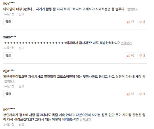 不過一經韓國媒體報導,往以乎普遍無法買單,有人認為現在道歉為時已晚並表示「現在才道歉不會太晚了嗎」、「你也是在裝裝道歉樣子吧」,當然也有人出面護航認為雙方家屬在當時早就已經和解,希望外界能網開一面。