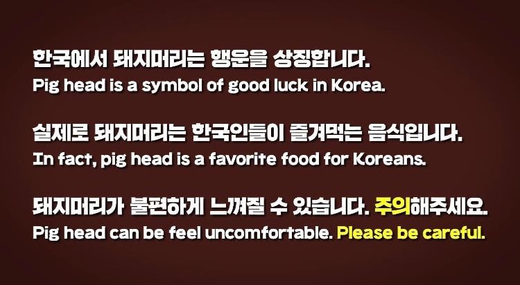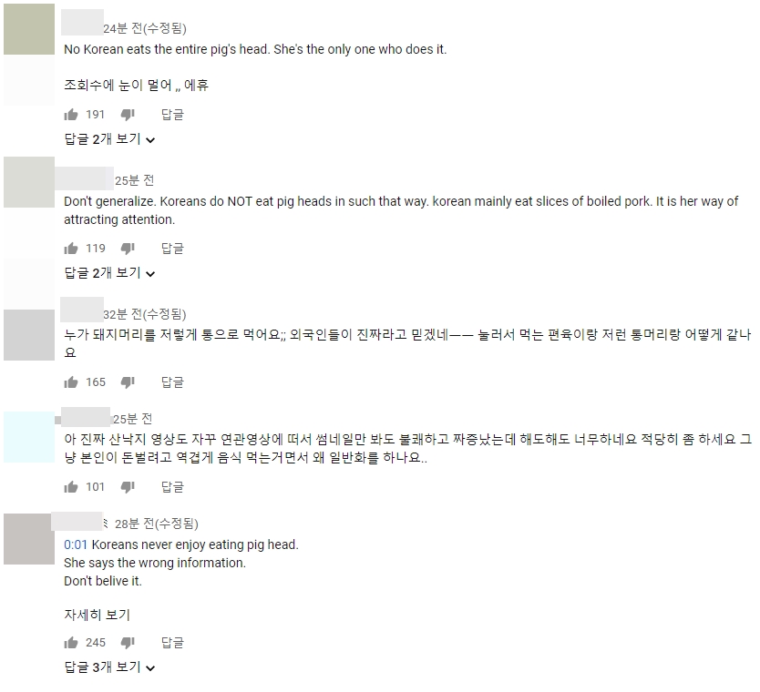 然而近期該名網紅再度分享一支「吃豬頭」的ASMR,更以此介紹韓國飲食文化,聲稱「豬頭在韓國有幸運的象徵」、「韓國人也非常喜歡吃豬頭」,接著徒手肢解豬頭開始錄製ASMR。對此,不少韓國網友也出面澄清該名網紅傳達的韓國文化錯誤並說到「沒有韓國人會這樣吃,大家都適切成薄片吃」、「請不易相信他說的,韓國人沒有愛吃整個豬頭皮」。