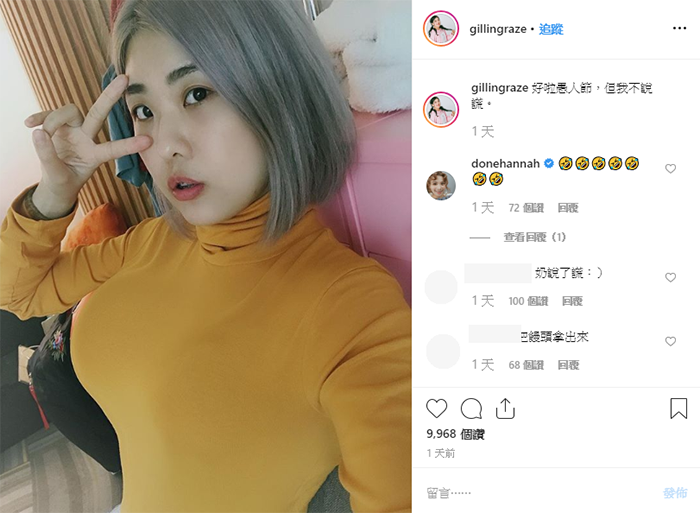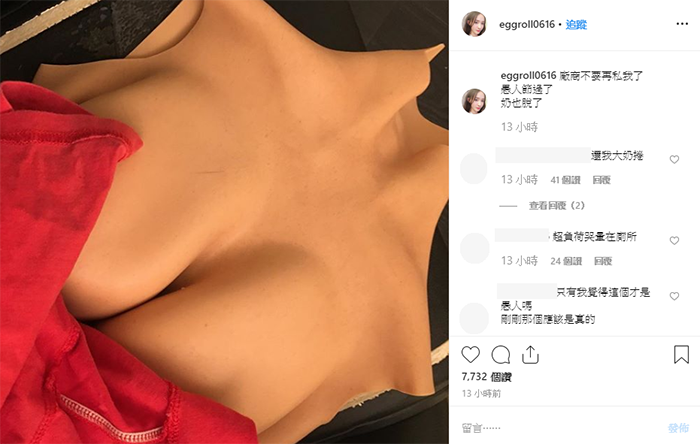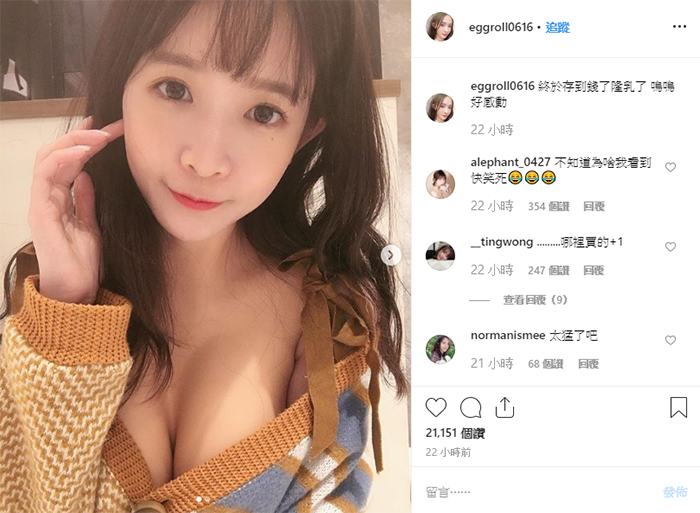 昨(4月1日)是一年一度的愚人節,蛋捲則在自己的IG中上傳一張火辣爆表的照片,只見照片中的她開襟毛衣外套下滑,胸前的「胸器」相當搶眼,可謂是她尺度最大的一次,而她也打上:「終於存到錢了隆X了 嗚嗚,好感動」,而照片上傳之後,阿樂、妮妮、諾曼也紛紛留言:「不知道為啥我看到快笑死」、「哪裡買的+1」、「太猛了吧」。